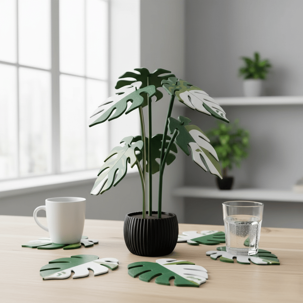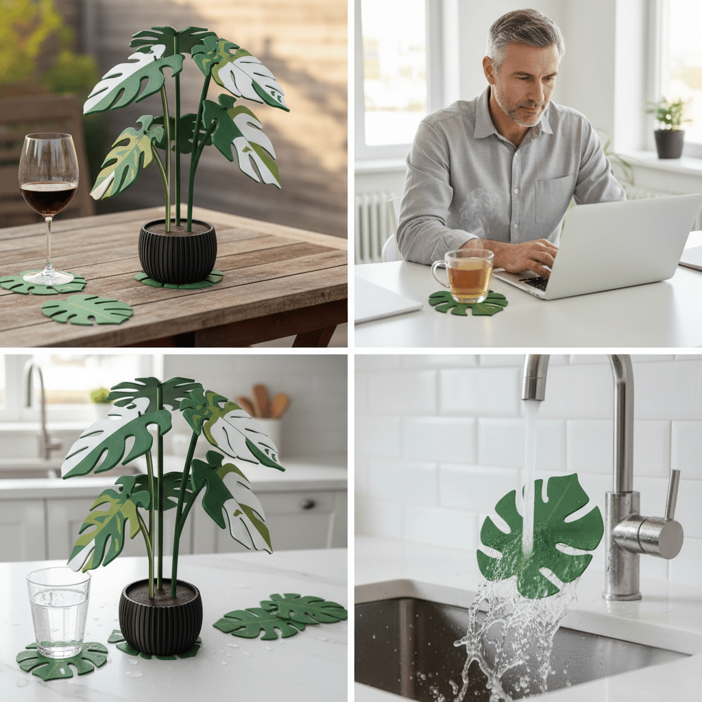 Stop cluttering your table with ugly stacks of coasters. This creative set transforms functional coasters into aĀ stunning Monstera plant centerpieceĀ thatĀ adds a refreshing pop of natureĀ to your desk or coffee table without taking up extra space.